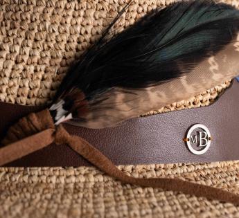 Questo Cappello Outback in rafia lavorata all’uncinetto si distingue per la cintura in pelle intagliata, il cui rilievo disegna una catena montuosa all’orizzonte. Questo sapiente mix di materiali—pelle, suede e piuma naturale—richiama la bellezza essenziale di un paesaggio selvaggio.