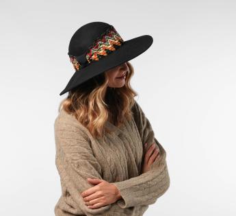 Cappellina in lana infeltrita realizzata in Italia, con una silhouette flessibile ed elegante. Si distingue per le guarnizioni intrecciate con motivi a zigzag multicolori, che aggiungono un tocco bohémien e luminoso all'insieme. Un gioco di texture sorprendente per un cappello pieno di personalità.
