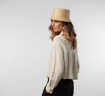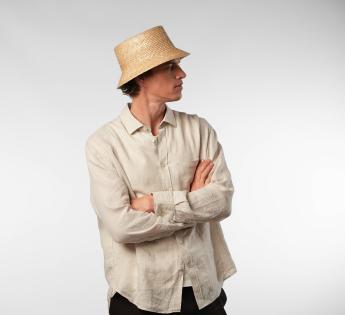 Cappello alla pescatora realizzato con paglia cucita. Il cappello è lasciato "nude", ovvero senza guarnizioni. Infine, una leggera vernice dona un tocco di lucentezza riflettente all'insieme.