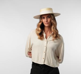 Tutto è possibile con la moda! È estate, il canotier si concede i larghi bordi della capeline per un risultato femminile molto alla moda. Realizzato in paglia, il cappello è quindi aéré e molto utile sotto il sole, ad esempio, in riva all'acqua. Il suo design raffinato conquista per la sua semplicità e convincerà per la sua adattabilità.