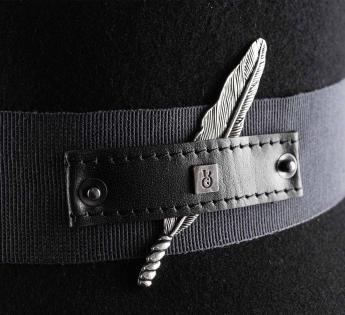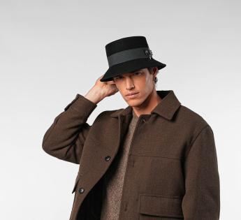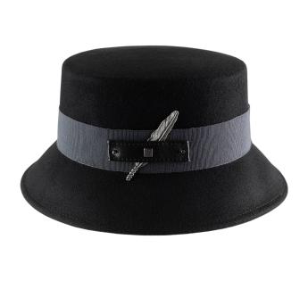 Audace e strutturato, questo cappello alla pescatora in feltro di lana affascina con il suo stile contemporaneo. È decorato con una larga cinta in gros-grain ornata da guarnizioni metalliche a forma di piuma, fissata su una linguetta in pelle impunturata.