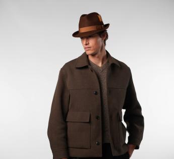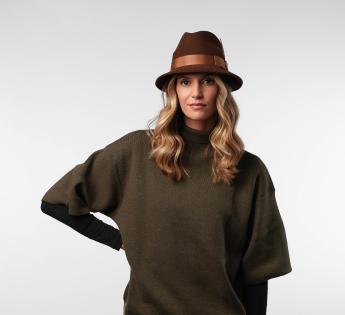 La sua cinta in grosgrain tono su tono, arricchita da un'Etichetta metallica discreta, rafforza la sua estetica raffinata. Ideale per il tempo umido o in viaggio, questo cappello in feltro idrorepellente unisce protezione, flessibilità e tenuta impeccabile. Un must per gli amanti dei copricapi pratici, con un look curato e strutturato.