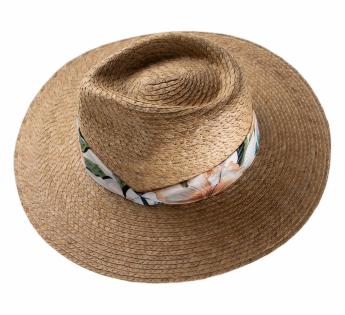 Questo cappello ha tutto ciò che fa venire voglia d’estate. La sua linea flessibile, la tesa larga e le guarnizioni floreali evocano giornate luminose, aria salmastra e quelle silhouette femminili che sembrano subito più leggere sotto il sole.