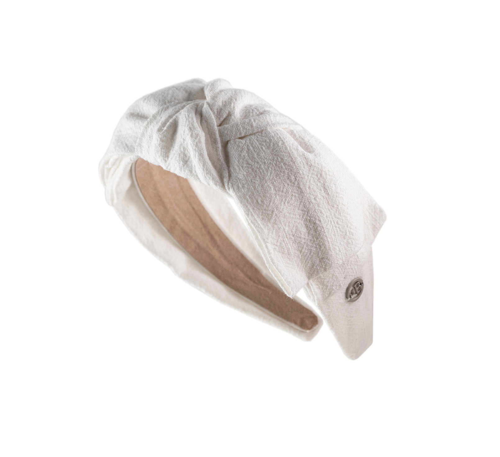 Realizzato nel nostro atelier, questo gioiello per capelli trova il perfetto equilibrio tra Fascia per capelli e turbante. Il doppio nodo intrecciato in lino, leggermente asimmetrico su un lato, dona un’allure unica, raffinata ma mai rigida.