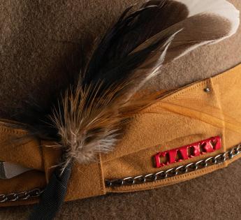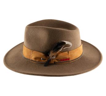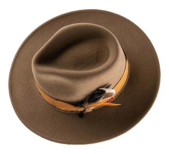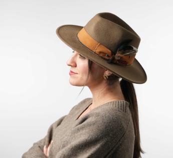 L'associazione di diverse materie e texture è una delle tendenze di moda di questa stagione. Scopri tu stesso questa combinazione di feltro e pelle scamosciata ben pensata. Il risultato è un cappello classico alzato da una cinta di colore naturale vivace, con cuciture, fantasie e una piuma. Così possiamo godere di una creazione a cui è stata aggiunta una bella nota di brillantezza.