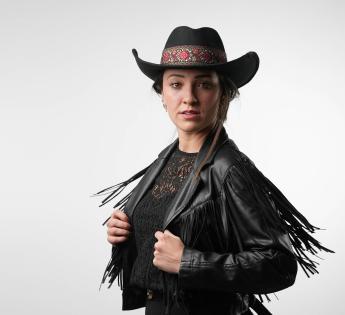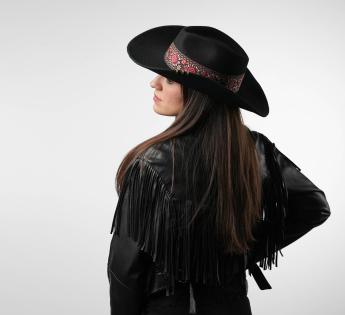 Cappello western dallo stile bohémien, realizzato nel nostro atelier di Lione. Fabbricato in feltro di lana italiano, caldo e naturalmente impermeabile, si distingue per la sua ampia tesa color latte, modulabile secondo lo stile desiderato. Una creazione artigianale pensata per affrontare l'inverno con eleganza e carattere.