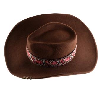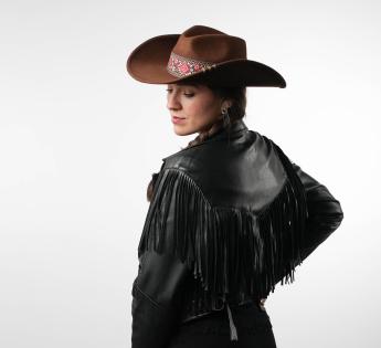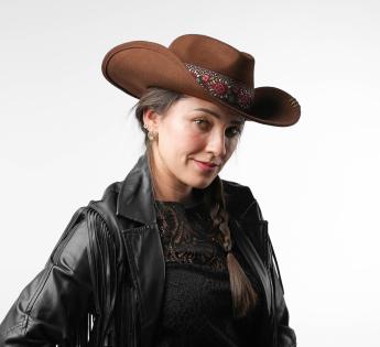 Cappello western dallo stile bohémien, realizzato nel nostro atelier di Lione. Fabbricato in feltro di lana italiano, caldo e naturalmente impermeabile, si distingue per la sua ampia tesa color latte, modulabile secondo lo stile desiderato. Una creazione artigianale pensata per affrontare l'inverno con eleganza e carattere.