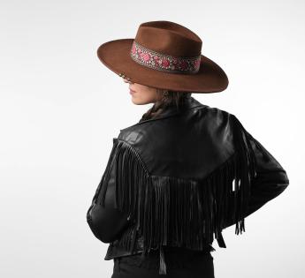 Il suo gallone ricamato, con ricchi motivi floreali, aggiunge un tocco di esotismo e raffinatezza. Tre gioielli metallici fissati sulla tesa aggiungono una nota originale e decisa. Un cappello di qualità, dallo spirito nomade, perfetto per chi è alla ricerca di un accessorio con una forte personalità.
