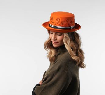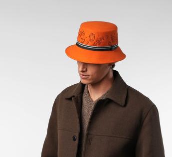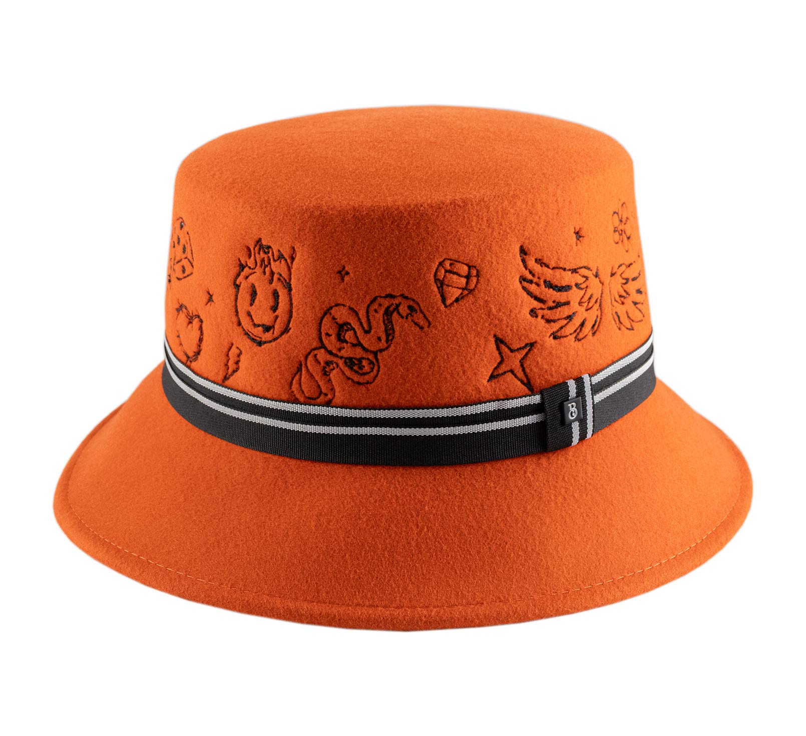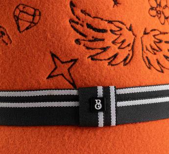 Colorato, audace e ultra-creativo, questo cappello alla pescatora in feltro di lana reinventa i codici del copricapo. La sua cupola piatta è interamente ricamata con motivi grafici in stile tatuaggio, per un tocco street e originale. La cinta a righe struttura l'insieme, arricchita da un'Etichetta metallica al centro. Questo modello attira tutti gli sguardi, affermando una vera libertà di stile.