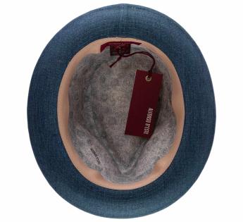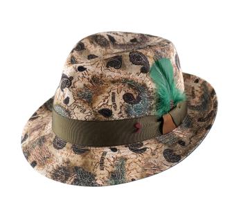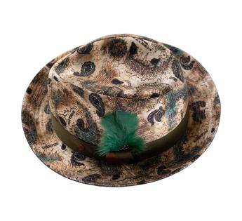 Questo Cappello Player Alfonso D’Este è molto più di un semplice accessorio, è un pezzo da collezione. La sua stampa cartografica e i motivi paisley su lino pregiato raccontano una storia di eleganza viaggiatrice. La piuma smeraldo vibrante e le finiture curate donano una presenza artistica inconfondibile.