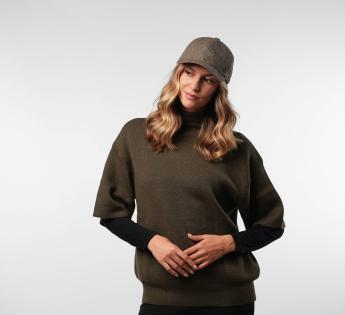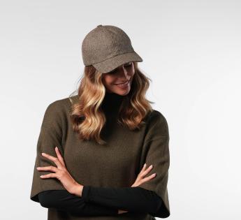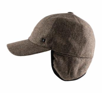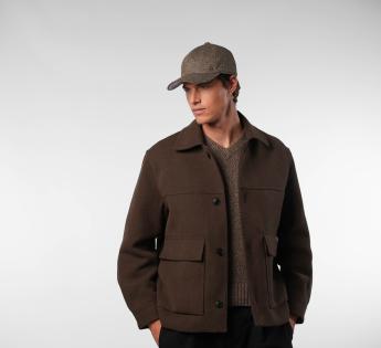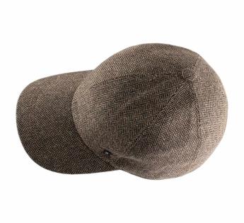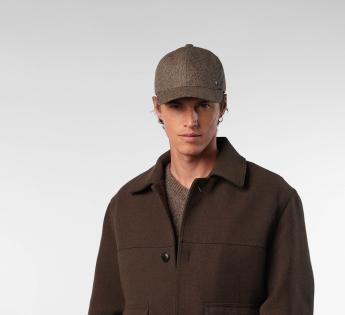 Il suo tessuto a spina di pesce con un tocco lanoso evoca l'eleganza dei materiali tradizionali, mentre la sua visiera in finta pelle offre un gioco sottile di materiali, caldo e raffinato.