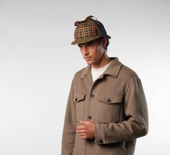Ispirato al famoso cappellino di Sherlock Holmes, questo modello 'deerstalker' rivisita lo stile iconico del detective inglese con un tocco contemporaneo. Realizzato in vero tweed britannico, combina motivi pied-de-poule multicolori con pannelli uniti per un look originale e sofisticato.